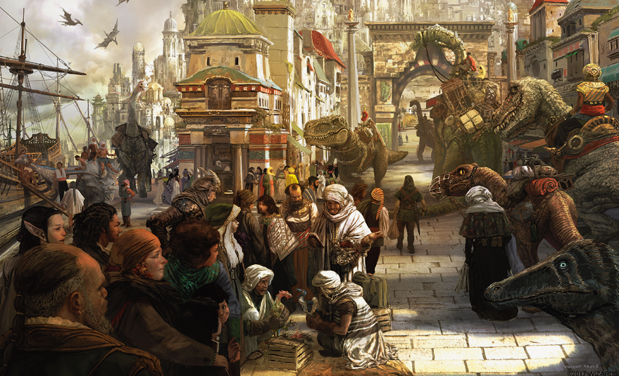Upon the sea, there is little evidence of anything amiss. The voyage is smooth and bright, and even as they pull into the docks at Port Nyanzaru on the northern side of Chult they are greeted not by death and decay but by a thriving seaside metropolis bustling with people. Here, they meet their guides, Bruja and Darkbeak, whose decades of experience in the hostile Chultan wilderness make them all but indispensable. Introductions are short, for their is much work to do. The group splits up to make a preliminary sweep of the area, asking questions about the city, the people, and Chult itself. They learn that Port Nyanzaru is the only truly thriving city in the entire continent: their proximity to the sea makes them an important stop for trade routes both incoming and outgoing. To this end, Chult is ruled not by a governor or king but by a council of merchant princes, each presiding over a particular export: everything from food and liquor to boats and sellswords. Sellswords: for the time being, that was what they were. The party set to work fashioning a rudimentary advertisement for their mercenary company (Bruja turns out to be a surprisingly capable artist) and tack it to the job board in the local tavern, Summer Wine. They order drinks, toast to camaraderie, prosperity, and health, and begin to settle in when a shattering scream is heard from outside. The bar clears out, and they with it.