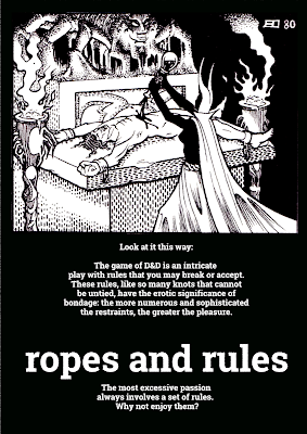 As if it wasn't enough that we were given a thoroughly unique and interesting setting, The Gardens of Ynn also includes a new player class, to be used when replacing dead PCs. Because the PCs will never encounter other (living) adventurers here, new PCs assume the role of Ynn Changelings, souls that have been twisted by the gardens and as such command unique powers that allow them to subsist solely on foraged vegetation, grant them an increased chance to hide in tall foliage, and even survive rudimentary forms of death by temporarily becoming plants themselves. The overarching plot, The Idea of Thorns, is also given some weight, and includes a Death Frost Doom-style endgame scenario should the PCs unwittingly bring it back with them to the real world. It's cool, and I can easily see an entire campaign spinning off from just a few sessions spent in the Gardens, as the players try to control and quarantine the Idea before it spreads.